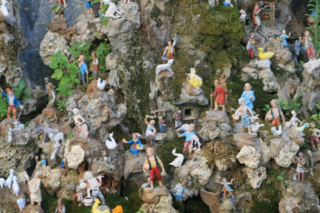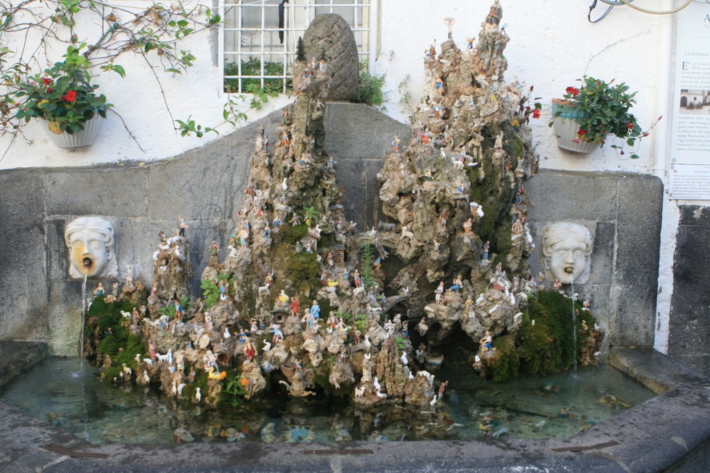 Erneutes Schlendern durch die Stadt, wobei wir einen skurrilen Brunnen entdeckten. Der Brunnen heißt la Fontana de cape e ciucci. Im 18. Jh. wurde an der Stelle ein Brunnen bzw. Eseltränke gebaut für die Esel, die mit Früchten und Gemüse beladen aus dem Nachbardorf kamen. 1974 hat man diese skulpturale Szenerie gebaut, wobei der alte Brunnen integriert wurde.