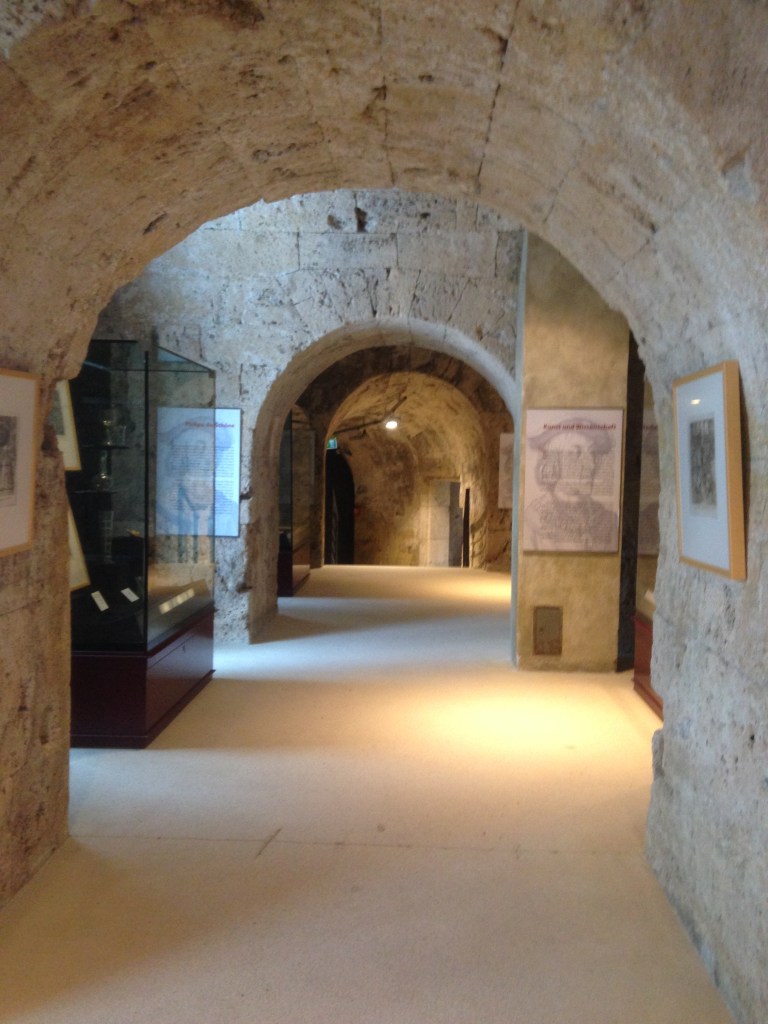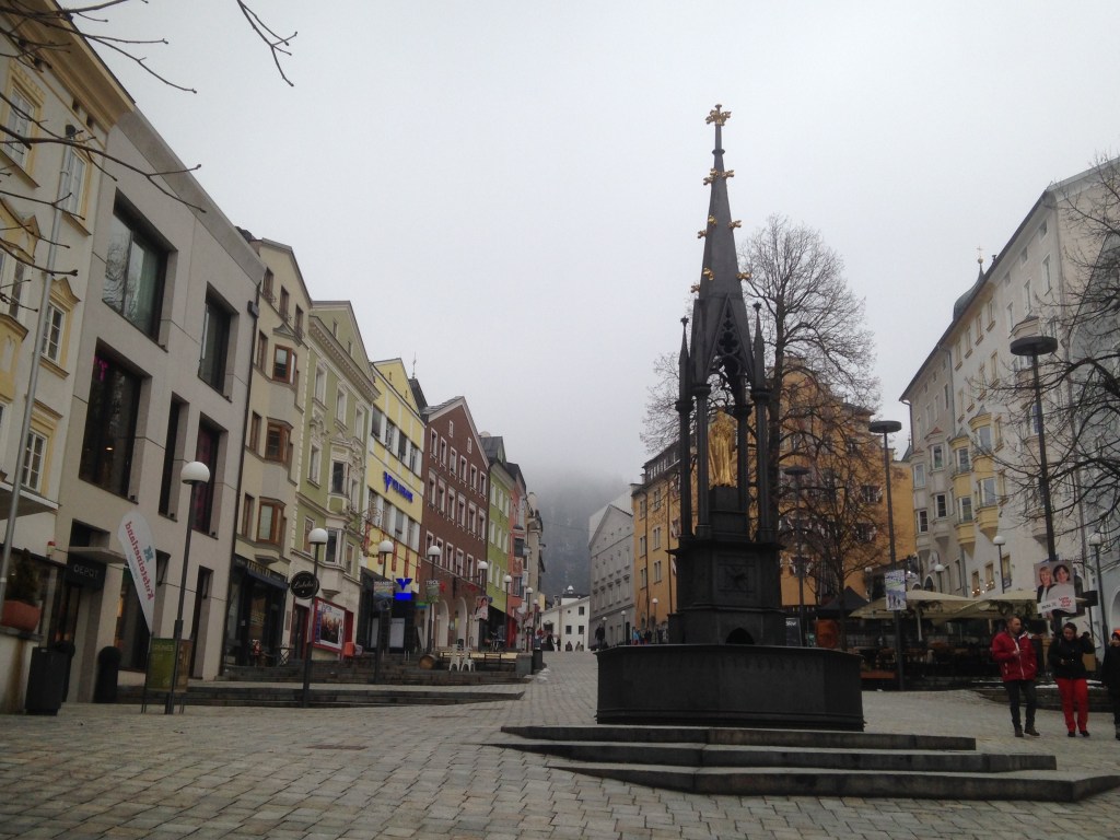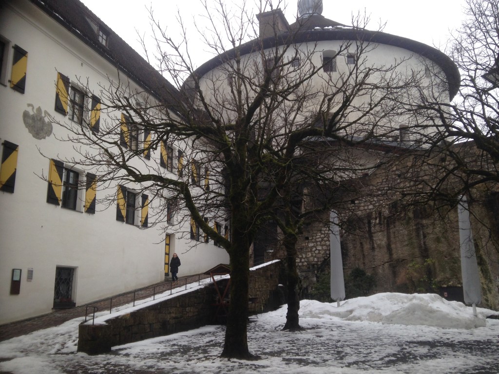 Wir hatten zwei schwere Koffer und zwei schwere Rucksäcke, die wir gern am Bahnhof zur Verwahrung abgegeben hätten. Es war sehr trüb und kalt in Kufstein. Im Reisezentrum wurde uns gesagt, dass es im Bahnhof Kufstein keine Möglichkeit gebe, das Gepäck abzugeben. Also machten wir uns auf den Weg in Richtung Zentrum und zogen die schweren Koffer hinter uns her. Wir wollten irgendwo einkehren und uns einen Kaffee gönnen. Als wir aber aus dem Bahnhofsgebäude traten, schaute uns schon die majestätische Kufsteiner Festung vom gegenüberliegenden Hang auf uns herab. Wir liefen wie angezogen weiter, zunächst über die Brücke und dann die leichte Steigung nehmend in Richtung der Festung. Auf dem Kopfsteinpflaster machten unsere Koffer höllischen Lärm, sie wurden immer schwerer. Am Fuß des Hangs angelangt, sahen wir, dass es eine Seilbahn gibt. In der Seilbahnstation, die sich als ein sehr schickes Besucherzentrum entpuppte, durften wir dann endlich unsere Koffer abstellen – für 10 Euro pro Kopf Eintrittspreis. Es hat sich aber echt gelohnt. Die Festung hat uns angenehm überrascht, auch an diesem trüben, nasskalten Winternachmittag. Wir bedauerten, dass wir so wenig Zeit hatten. Das Festungsmuseum hätten wir uns gern angeschaut. Dafür war nun wirklich keine Zeit mehr. Wir sind mit der Seilbahn bzw. Panoramabahn hochgefahren und schnell einen halben Rundgang gemacht und wieder runtergefahren.